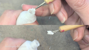 チューブ入口の補修材が硬くドットペンを使って硬い部分を取り除く作業